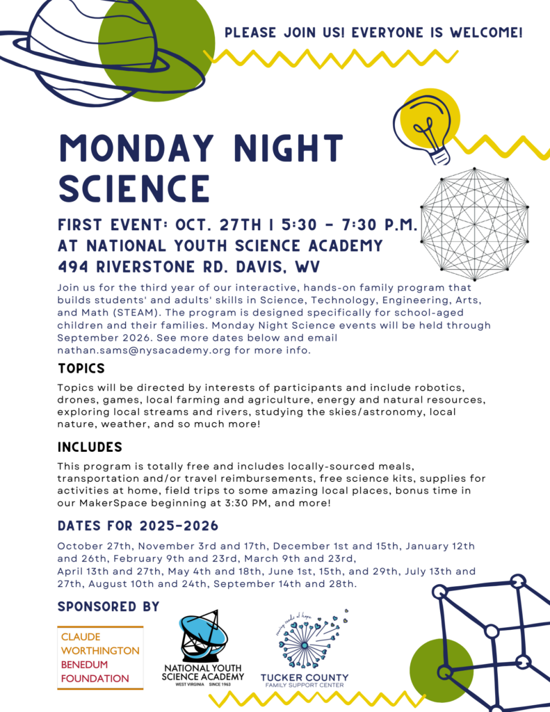 Modeled on the dream of our 2022 National Youth Science Camp Alum of the Year, Dennis Schatz (CO 1965), we are proud to host the third year of our local program, Monday Night Science! Email Associate Director Nathan Sams for more information. Dates are also posted on our Calendar of Events. A huge thank you to the Claude Worthington Benedum Foundation for sponsoring this program, and to our partners at the Tucker County Family Support Center for helping to make these events possible!